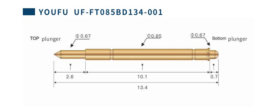 หมุด Pogo แบบสปริงโหลดสองหัว UF-FTO85BD134-001 ที่มีความแม่นยำสูง ออกแบบมาเพื่อประสิทธิภาพที่เชื่อถือได้ในการใช้งานการทดสอบที่ต้องการ รวมถึงความสามารถในการทดสอบ BGA ประสิทธิภาพสูงสำหรับเซมิคอนดักเตอร์และแผ่นเวเฟอร์ SiC